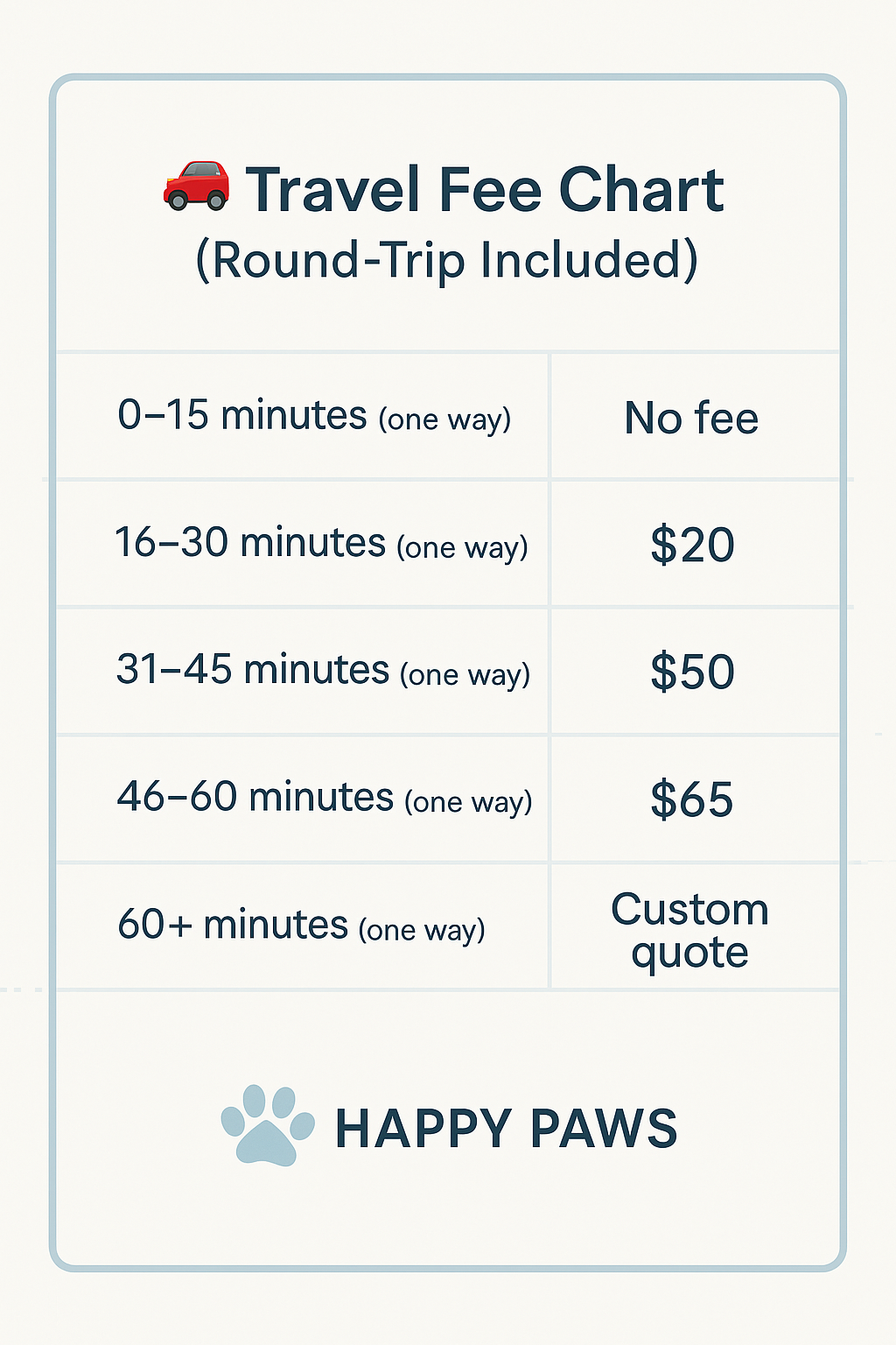 Extended Care Visit – Includes extended playtime, brushing, and extra enrichment. Great for seniors, post-surgery pets, or those needing more attention. | 45 min | $35 |